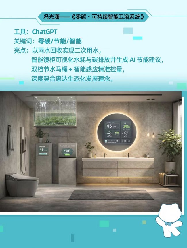 大赛涌现的作品充分展现了科技与设计融合的深度与广度。冯光潇的《零碳·可持续智能卫浴系统》以雨水回收、智能镜柜可视化水耗与碳排放为核心,深度契合惠达生态化发展理念。李洋洋的《仿生·羽化》将植物有机形态融入设计,实现美学与人机工程学的完美闭环。彭玉楠的《生物智能马桶》以医疗级健康为切入点,集成全息悬浮UI与大数据健康守护功能,与惠达智能健康研发理念高度契合。